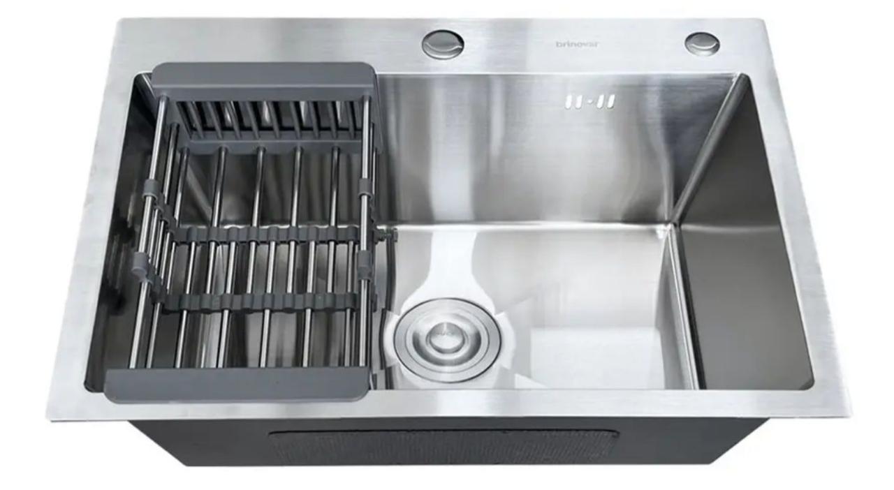 Além disso, a cesta integrada facilita o manuseio de alimentos e utensílios, mantendo a bancada organizada, enquanto o dispenser de sabão embutido oferece praticidade, eliminando a necessidade de frascos extras sobre a pia.