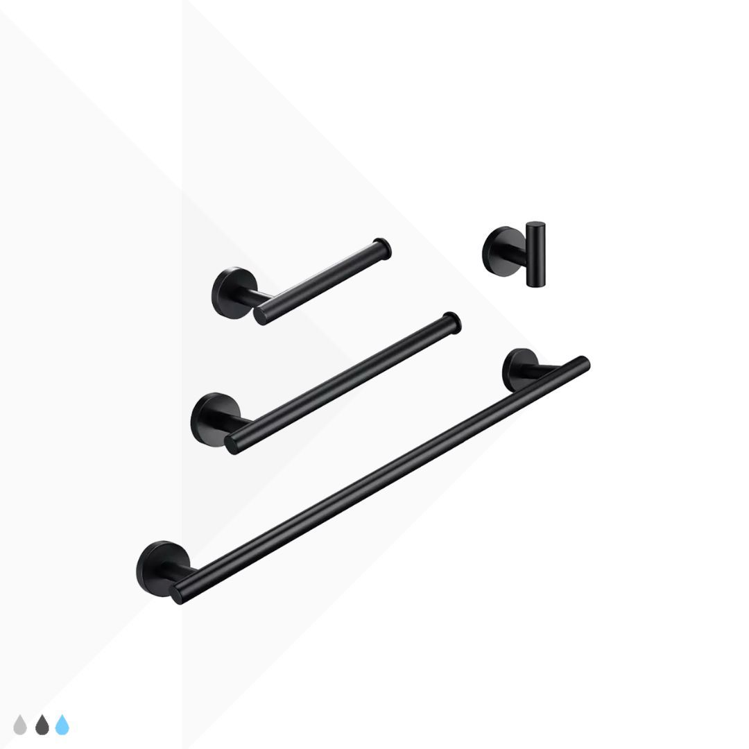 O Kit de Acessórios para Banheiro Elegance - Black é composto por 4 metais sanitários: Porta Toalha de Banho, Porta Toalha de Rosto, Papeleira, e Cabide. Todas as peças são fabricadas em metal especial de alta resistência e possuem acabamento de alto padrão, sendo ideais para uso em banheiros ou lavabos.