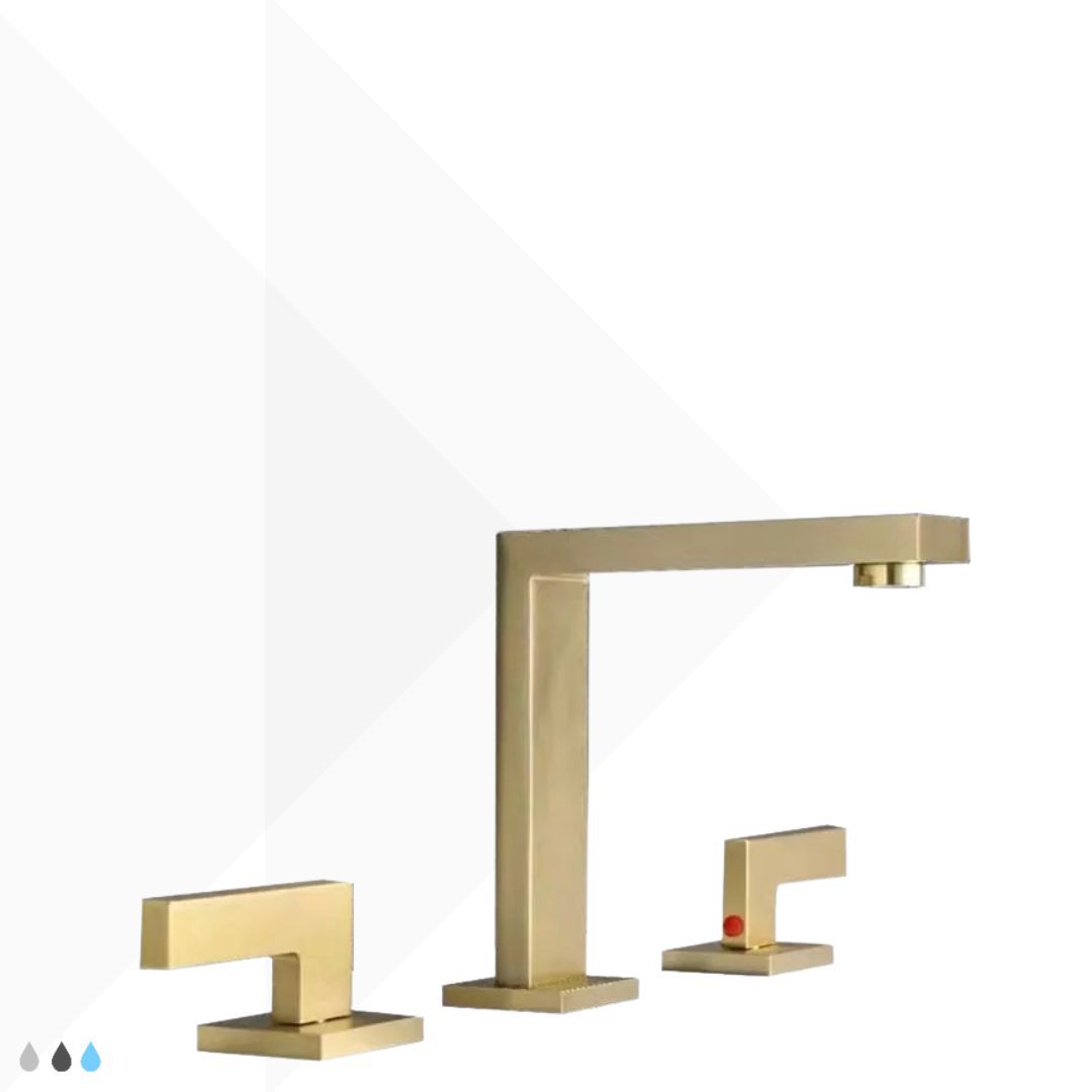 A Torneira Duplo Comando Valence possui um design sofisticado e contemporâneo na cor dourada com acabamento escovado, projetada para banheiros e lavabos.